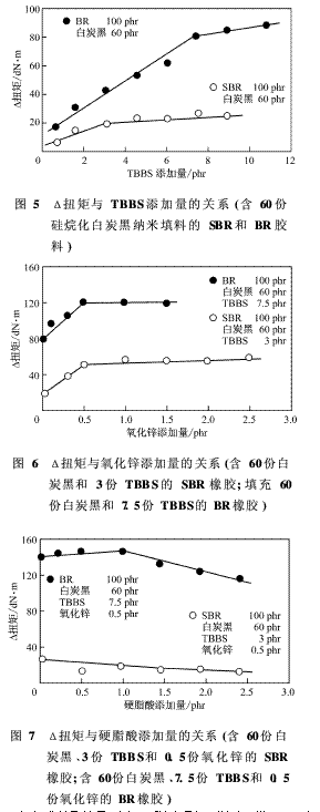 ●含有3份TBBS和0. 5份氧化鋅的SBR,以及含7. 5份TBBS和0. 5份氧化鋅的白炭黑填充BR,添加硬脂酸對(duì)橡膠-填料相互作用并沒有額外的好處,實(shí)際上反而對(duì)其有害。