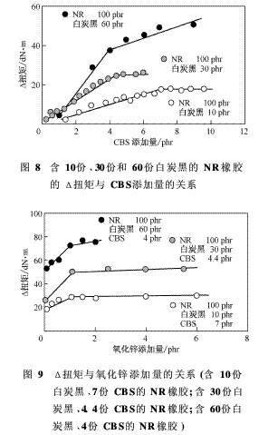 對(duì)于一定的橡膠, CBS的需要量取決于白炭黑的配合量,但其對(duì)氧化鋅的需求量與白炭量和CBS的配合量無關(guān)。