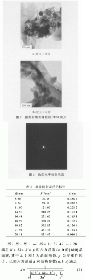 根據(jù)表1數(shù)據(jù)計算得對照常見晶體標準電子衍射花樣,可以確定各個斑點指數(shù)(hkl),把各斑點指數(shù)值代入上式可得參數(shù)a的平均值為0.248 9 nm。對于六方晶系結構的晶體,其晶格參數(shù)a=b;同樣方法可以得到疲勞前的炭黑晶格參數(shù)為a=b=0.250 9 nm。因此,可以認為炭黑晶體結構在疲勞前后幾乎沒有變化。另外,試驗得到的炭黑晶格參數(shù)稍高于文獻[8,9]中的炭黑數(shù)據(jù)a=b=0.246 nm,這可能是由于試驗中斑點測量時存在偏差。