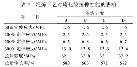 混煉工藝對硫化膠拉伸性能的影響如表1所示,硫化時間為25 min。
