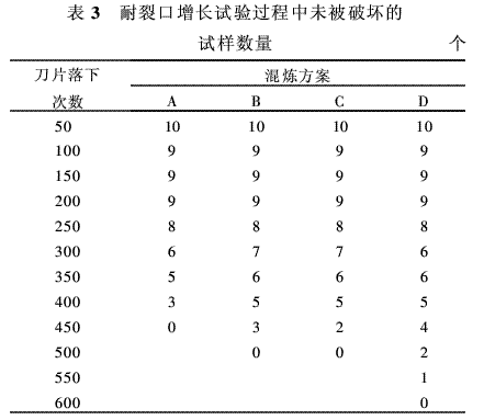 從表3可以看出,方案A硫化膠的耐裂口增長性能最差,方案D硫化膠的耐裂口增長性能最好。混煉工藝不同的4種硫化膠的耐裂口增長性能在刀片落下300次之前未被破壞的試樣數(shù)量完全一樣,耐裂口增長性能的差別在試驗后期才顯示出來,這基本可以說明該試驗方法能夠模擬輪胎在長時間使用過程中逐步累積最終被撕裂這一情況。