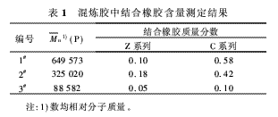 橡膠中添加炭黑、白炭黑等是其主要補(bǔ)強(qiáng)方式,填料加入到橡膠中能與基體形成不溶于橡膠良溶劑的結(jié)合橡膠。橡膠分子鏈的部分鏈段通過(guò)物理或化學(xué)作用吸附于填料表面,同一段橡膠分子的不同鏈段被不同填料粒子吸附而起到橋梁作用,并包裹填料,高分子鏈相互纏結(jié)在填料表面形成不溶的結(jié)合橡膠層。研究表明,結(jié)合橡膠含量隨混煉膠停放時(shí)間的延長(zhǎng)而增大,最后達(dá)到飽和;結(jié)合橡膠的穩(wěn)定過(guò)程是一個(gè)小分子鏈逐步被大分子鏈取代的過(guò)程[1]。因此,橡膠的相對(duì)分子質(zhì)量是影響結(jié)合橡膠的重要因素。
