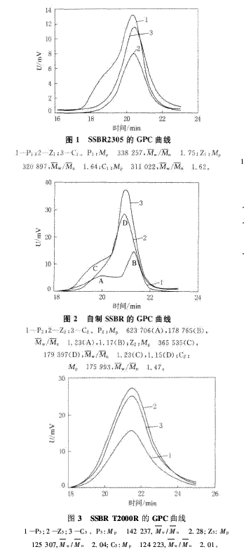 SSBR,苯乙烯質(zhì)量分?jǐn)?shù)為0.235~0.25,錫偶聯(lián)型SSBR(編號(hào)為P1),牌號(hào)2305(偶聯(lián)度40%),中國(guó)石化北京燕山石油化工股份有限公司產(chǎn)品;錫偶聯(lián)型SSBR (編號(hào)為P2),偶聯(lián)度100%,自制;線形SSBR (編號(hào)為P3),牌號(hào)T2000R,中國(guó)石化上海高橋石油化工公司產(chǎn)品;白炭黑,牌號(hào)為T(mén)OKUSIL 255,江西南吉化學(xué)工業(yè)有限公司產(chǎn)品;偶聯(lián)劑Si69,南京曙光化工集團(tuán)有限公司產(chǎn)品。