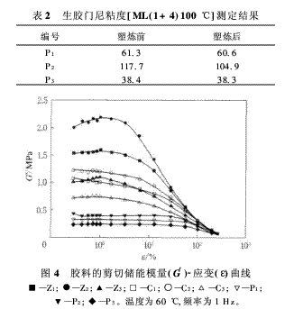 將純膠在Фl60 mm×320 mm開(kāi)煉機(jī)上薄通7次,用北京環(huán)峰化工機(jī)械實(shí)驗(yàn)廠生產(chǎn)的MV-C3型門(mén)尼粘度儀測(cè)試塑煉前后橡膠的門(mén)尼粘度值。
