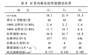 白炭黑原位改性后硫化膠(C系列)物理性能見(jiàn)表3。由表3可見(jiàn),相對(duì)分子質(zhì)量較高的C1和C2硫化膠的定伸應(yīng)力、拉伸強(qiáng)度和撕裂強(qiáng)度都高于相對(duì)分子質(zhì)量較低的C3硫化膠。阿克隆磨耗量從小到大的順序?yàn)镃1,C3,C2,與基體的相對(duì)分子質(zhì)量及混煉膠的結(jié)合橡膠含量沒(méi)有體現(xiàn)出直接對(duì)應(yīng)關(guān)系。
