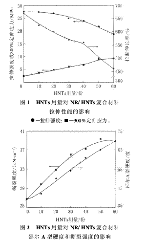 (1)隨著HNTs用量的增大,NR/HNTs復合材料的邵爾A型硬度、300%定伸應力和撕裂強度增大,拉伸強度和拉斷伸長率減小。