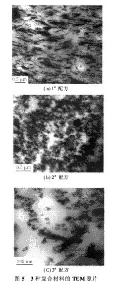 1#~3#配方膠料的SEM和TEM照片分別如圖4和5所示。從圖4和5可以看出,在混煉加工過程的機械剪切力等作用下,除部分HNTs團聚外,未經任何改性處理的HNTs在NR基體中的分散較好,且具有一定取向。這是由于HNTs的結構單元之間是以氫鍵和范德華力等次價鍵的形式結合,比較容易實現(xiàn)結構單元的解離與分散。