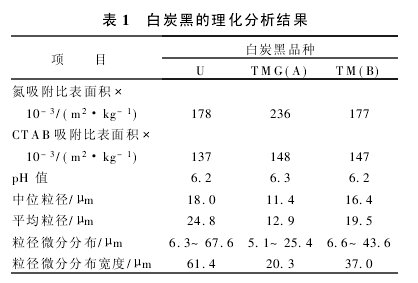 從表1可以看出,與白炭黑U相比,白炭黑 TM(B)的氮吸附比表面積和pH值基本相同, CTAB吸附比表面積較大;白炭黑TMG(A)的氮 吸附比表面積、CTAB吸附比表面積和pH值均較大,尤其是氮吸附比表面積比白炭黑U大約 33%。白炭黑的比表面積越大,補強性能越好。白炭黑U的粒徑大且分布寬,白炭黑TMG (A)的粒徑小且分布窄。白炭黑的粒徑及其分布 對膠料的加工性能有很大影響。