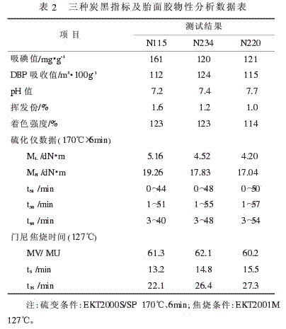 上述配方在其他條件相同時(shí),僅改變炭黑的品種,N115炭黑因其具有很高的比表面積,分散相對困難,因此將其用量減少5份,而N234與N220炭黑均采用55質(zhì)量份。三種炭黑指標(biāo)及其胎面膠硫變及門尼數(shù)據(jù)見表2。