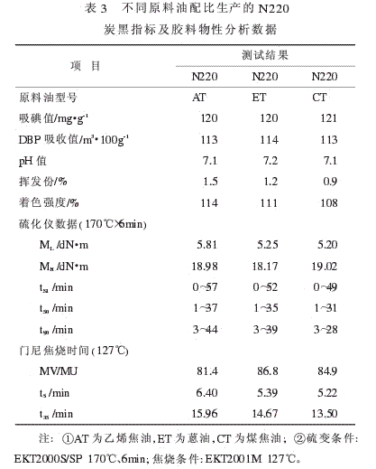 同時(shí)還可以看出,填充用乙烯與蒽油配成混合油生產(chǎn)的N220炭黑的膠料,其焦燒時(shí)間最長,硫化速度最慢,加工安全性最好。