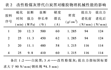 將改性后的粉煤灰填加到橡膠中,其試驗配方按2.3。硫化膠的力學(xué)性能如表2所示。