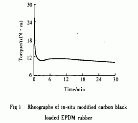 EPD.M炭黑混煉膠的原位改性將一定量EPDM混煉膠置于加工性能測(cè)試儀中(轉(zhuǎn)子轉(zhuǎn)速為40 r/min ) ,160℃下處理5 min制得原位改性EPDM炭黑混煉膠。