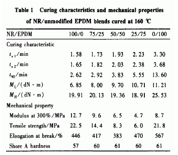 NR/EPDM共混膠將NR和EPDM炭黑混煉膠及原位改性的EPDM炭黑混煉膠分別按一定比例混合,按配方制備各種NR/EPDM共混膠。