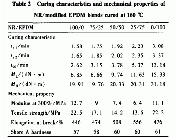 2. 2未改性EPDM炭黑混煉膠與NR共混膠的性能