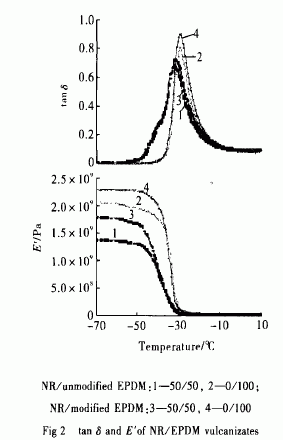 c)改性后NR/EPDM為50/50的共混硫化膠具有更寬的T:范圍、更大的tanδ值及更寬的損耗峰,說明NR與EPDM的硫化相容性得以提高。