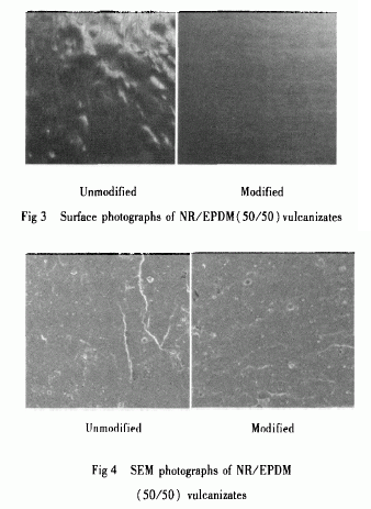 從圖4可以看出,未改性時(shí)EPDM在NR/EPDM中的分散狀態(tài)很差,存在破損的表面;改性后的試樣斷面具有更為均勻的構(gòu)造和外觀,具有較未改性時(shí)高得多的致密程度。這說明EPDM炭黑混煉膠經(jīng)原位改性后與NR的硫化相容性得到顯著改善。