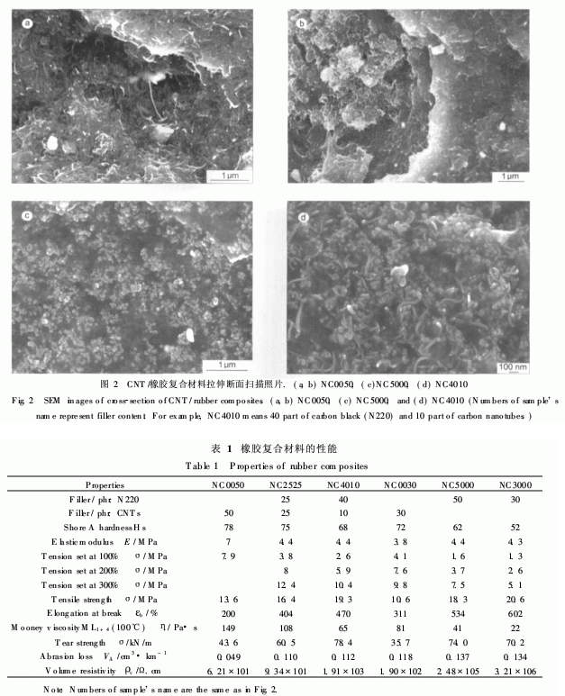 表1為CNT/橡膠復(fù)合材料的性能。從表1可以看出,CNTs的加入能顯著提高CNT/橡膠復(fù)合材料的硬度、定伸應(yīng)力、門尼黏度,降低橡膠材料的磨耗和體積電阻率。其中提高最顯著的是復(fù)合材料的導(dǎo)電性。可以認(rèn)為CNTs的長(zhǎng)徑比大,在基體中易于形成導(dǎo)電網(wǎng)絡(luò),從而大幅度地降低橡膠復(fù)合材料的體積電阻率。但單獨(dú)加入CNTs的樣品NC0050和NC0030拉伸強(qiáng)度、撕裂強(qiáng)度和斷裂伸長(zhǎng)率都遠(yuǎn)小于單獨(dú)加入炭黑的樣品NC5000和NC3000。這主要是由于CNTs的比表面積和長(zhǎng)徑比大,在與橡膠交聯(lián)過程中有較多的交聯(lián)點(diǎn),空間交聯(lián)度大,吸附在CNTs之間的橡膠分子鏈短,當(dāng)受到應(yīng)力作用時(shí),橡膠分子鏈滑動(dòng)距離短,之后很快斷裂。若CNTs的加入量較大,則因CNTs分散性較差,基體中的CNTs團(tuán)聚體和多出處缺陷(孔洞),以使CNTs的力學(xué)性能沒有充分發(fā)揮。CNT/膠復(fù)合材料斷口形貌觀察表明,斷口處存在孔隙、未充分分散的CNTs聚團(tuán)及被從基體中拔出的CNTs,均說(shuō)明CNTs在橡膠中的分散性以及與橡膠的交聯(lián)程度等因素會(huì)直接影響其補(bǔ)強(qiáng)效果。欲充分發(fā)揮CNTs的力學(xué)性能優(yōu)勢(shì),必須進(jìn)一步改善CNTs在橡膠中的分散狀態(tài)并提高二者的界面結(jié)合性能。