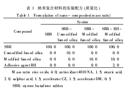 本工作將未改性氣相法白炭黑和采用有機(jī)改性 劑Si69改性的氣相法白炭黑應(yīng)用于丁苯膠(SBR) 中,試圖使氣相法白炭黑在SBR中良好分散,提高 氣相法白炭黑和SBR的結(jié)合力,從而提高納米復(fù)合材料的力學(xué)性能和壓縮屈撓性能。