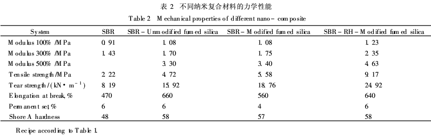 使用10份氣相法白炭黑、2份粘合劑RH時(shí),不 同納米復(fù)合材料的力學(xué)性能見(jiàn)表2。由表2可看 出,改性和未改性的氣相法白炭黑對(duì)丁苯膠都具有 補(bǔ)強(qiáng)效應(yīng),其中改性氣相法白炭黑的補(bǔ)強(qiáng)效應(yīng)更顯著。這可能一方面是因?yàn)闅庀喾ò滋亢诮?jīng)表面改性 后呈親油性,在高分子基體中的分散性得到改善;另 一方面是因?yàn)楸砻娓男詣㏒i69能與橡膠基體反應(yīng), 提高了氣相法白炭黑與橡膠之間的結(jié)合力。由表2還可看出,添加粘合劑RH后,納米復(fù)合材料的模量 和拉伸強(qiáng)度得到顯著改善,硬度也有所增加,同時(shí)永 久變形維持在較低值。納米復(fù)合材料體現(xiàn)出良好的 力學(xué)性能。這可能是因?yàn)檎澈蟿㏑H在橡膠中進(jìn)行原位聚合反應(yīng),對(duì)改性氣相法白炭黑與橡膠之間起 到粘合作用,提高了氣相法白炭黑與橡膠之間的結(jié) 合力;另外粘合劑RH也在橡膠基體中原位生成酚 醛樹(shù)脂,該樹(shù)脂能提高納米復(fù)合材料的模量和強(qiáng)度。