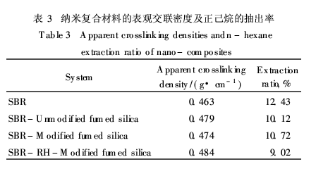 填充氣相法白炭黑和粘合劑RH的納米復(fù)合材 料的表觀交聯(lián)密度及正己烷的抽出率見(jiàn)表3。從表 3可看出,添加改性和未改性的氣相法白炭黑均能 提高納米復(fù)合材料的表觀交聯(lián)密度、降低納米復(fù)合材料的抽出率。這是因?yàn)闅庀喾ò滋亢趯?duì)SBR分 子鏈有限制作用;添加粘合劑RH后,納米復(fù)合材料 的表觀交聯(lián)密度進(jìn)一步增加,而抽出率下降。這是因?yàn)檎澈蟿㏑H增強(qiáng)了氣相法白炭黑與橡 膠之間的作用力,使氣相法白炭黑對(duì)橡膠分子鏈的 限制作用增強(qiáng)。