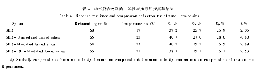 (4)回彈性及壓縮屈撓實(shí)驗(yàn)分析表明,添加粘 合劑RH可提高納米復(fù)合材料的回彈率。改性氣 相法白炭黑可降低納米復(fù)合材料的壓縮疲勞溫 升,減少丁苯膠在壓縮過(guò)程中的變形率及永久變形率,粘合劑RH和改性氣相法白炭黑復(fù)合使用 效果更佳。