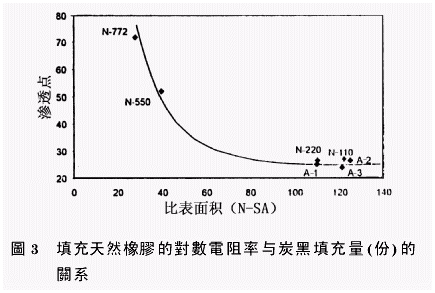 采用先前所述的膠料(見(jiàn)表1),對(duì)于N110、N220、N550、N772和A 1、A 2、A 3,分散度與電阻率相關(guān)。獲得的結(jié)果証實(shí),正如文獻(xiàn)所描述的那樣,滲透點(diǎn)是由炭黑的粒徑?jīng)Q定的。在這種情況下,A X品種的這個(gè)值與其比表面積一致。但是在其他的研究中,對(duì)高RSA的炭黑觀察到滲透點(diǎn)比預(yù)期的要低。這一事實(shí)可能歸因于較高的填料 填料相互作用,這樣的作用會(huì)導(dǎo)致炭黑在聚合物內(nèi)形成通道,降低其電阻率水平。不過(guò),如果類似的事情發(fā)生在A X品種上,就很難被檢測(cè)出來(lái),這可以從圖3中觀察到。在該圖中,這些炭黑的滲透點(diǎn)位于斜率非常小的區(qū)域,使得我們難以看出其差異。