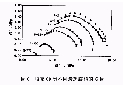 從圖6中可以看出,對(duì)于N110、N220、N550、N772,填料的比表面積減小招致G1?和G?值減小。當(dāng)配方中包含有這些炭黑時(shí),這種現(xiàn)象可能是填料 填料相互作用較強(qiáng)的標(biāo)志。在其他對(duì)填充有高RSA炭黑橡膠膠料的研究中,亦獲得了較高的G和G值。高RSA炭黑的表面活性能通過(guò)IGC(這種技術(shù)可以檢測(cè)出高極性的成分來(lái)測(cè)定。應(yīng)該指出的是,在初步的研究中對(duì)A1也發(fā)現(xiàn)了高特殊極性成分。但是,不僅該參數(shù)在這,兩種填料(高RSA和高無(wú)定形碳含量)之間是常見(jiàn)的,而且它們背離Maurer相關(guān)性也表明了不同于常規(guī)炭黑的行為。