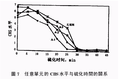 采用早先研究中摸索出的一種方法來(lái)評(píng)估硫化動(dòng)力學(xué),在該方法中遵循模型膠料硫化法(MCV),用角鯊烯作為天然橡膠的模型。圖7表明了促進(jìn)劑的分解,從而讓位給2 2? 二硫代二苯并 唑(MBTS)這樣的硫化中間體,即MBTP具有的結(jié)構(gòu)跟先前的膠料相同,但是硫塬子數(shù)增加了(P=1,2,3……)。由于能觀察到A 1具有較高的活化成分,填料表面(認(rèn)為在此發(fā)生了分解)的高度吸附可以解釋其較低的密度。這些結(jié)果還表明:早先形成的MBTS和硫化介質(zhì)內(nèi)的游離硫含量較低,歸因于其在角鯊烯鏈中摻混更快。對(duì)RSA高的炭黑品種也發(fā)現(xiàn)其分解更快。