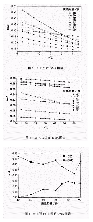 輪胎的抗?jié)窕允瞧囆旭傋钪匾陌踩阅?降低滾動(dòng)阻力是降低損耗的重要途徑。在通常情況下,頻率為10Hz時(shí),60℃左右的tanδ值可表征胎面膠的滾動(dòng)阻力,0℃左右下的tanδ值可表征胎面膠的濕抓著性。圖2、圖3所示分別為0℃和60℃左右的圖譜。從圖2、圖3中可以看出滾動(dòng)阻力隨著炭黑含量的增加而增加,濕抓著性能隨炭黑含量的增加而減小,反映出濕抓著性和滾動(dòng)阻力的矛盾性,濕抓著性好則滾動(dòng)阻力大,能耗就大。為更清楚的說明炭黑用量與滾動(dòng)阻力、濕抓著性的關(guān)系,選取0℃處和60℃處tanδ分別作圖,如圖4所示。