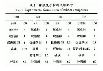 納米高嶺土,高嶺石片層徑厚比20:1-50:1,平均厚度2O一5O nm,平均直徑300 nm,屬于片層厚度小于100nm的二維納米粉體材料,比表面積為32 m2/g,松散密度0.05—0.07 g/cm ,山東棗莊三興高新材料有限公司產(chǎn)品;SBR,牌號1 500,吉林石化產(chǎn)品;NR,3號煙片膠,海南天然橡膠產(chǎn)業(yè)集團產(chǎn)品;BR,牌號9 000,燕山石化產(chǎn)品;EPDM,牌號4 045,吉林石化產(chǎn)品;白炭黑,牌號36—5,吉林通化產(chǎn)品.其它原材料均為市售品.橡膠復合材料的配方如表1所示.