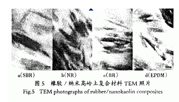 從圖5可知,高嶺石片狀顆粒 4種橡膠復合材料中絕大多數(shù)呈現(xiàn)次級結(jié)構(gòu)的片狀定向 行排列,片層厚度均小于100 nm,長度在300 nm左右.高嶺石的次級結(jié)構(gòu)片層已被橡膠分子有效的隔離開來,并且與橡膠基質(zhì)界面之間結(jié)合緊密,沒有明顯的孑L隙,這表明改性后的高嶺石片層在橡膠中分散良好,形成了二維高嶺石橡膠納米復合材料.高嶺石片層的定向平行排列,對提高復合材料的拉伸性能、耐熱性能起到了至關重要的促進作用.
