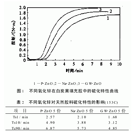 由于氧化鋅在硫化體系中主要是起活化作用的,因此其粒子的尺寸大小和表面活性將直接影響其活化作用大小,筆者選用了三種不同氧化鋅進(jìn)行了比較,其硫化特性見圖1和表2。