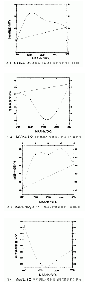 本實(shí)驗(yàn)研究了白炭黑、甲基丙烯酸鈉不同配比對(duì)硫化膠的物理機(jī)械性能的影響。