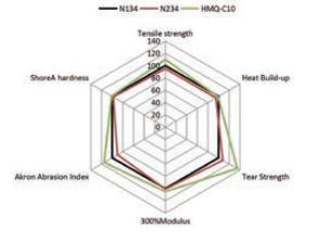 HMQ-C10具有良好的力學性能及導熱、導電性能,在全鋼胎面膠中,耐磨性能比N234提高20%以上,拉伸強度提高15%,抗撕裂性能比N134提高30%以上,硫化膠電導率及熱導率明顯增大。