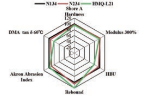 HMQ-L121推薦應用于低滾阻要求的全鋼胎輪胎胎面,有效降低滯后性能的同時沒有犧牲補強性和磨耗性能。