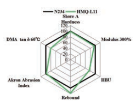 HMQ-L11 加工性能與N300系列炭黑相似;應用于工程車胎胎面中,補強性能、磨耗性能能與N200系列炭黑相當,撕裂強度提高20%,壓縮溫升、高溫損耗因子提高20%左右,回彈提高20%左右,滯后性能突出。