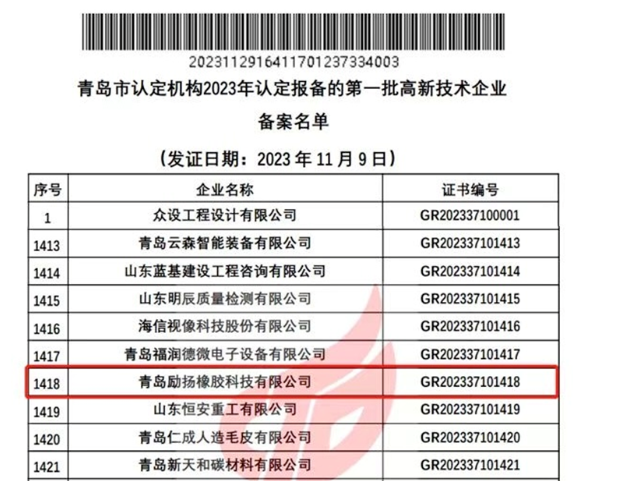 【炭黑產(chǎn)業(yè)網(wǎng)】12月5日消息,青島市高新技術企業(yè)認定管理工作網(wǎng)最近發(fā)布了關于2023年首批高新技術企業(yè)備案的公告,令青島勵揚橡膠科技有限公司備受矚目。