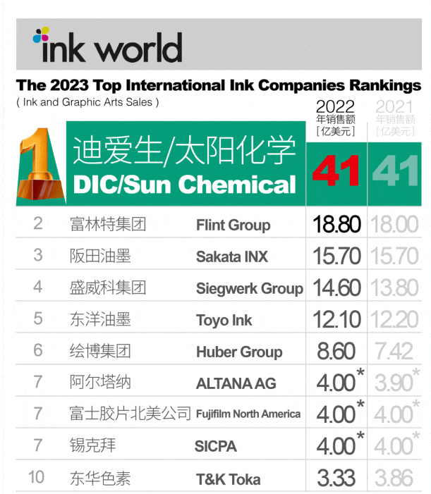 【炭黑產(chǎn)業(yè)網(wǎng)】12月25日消息,根據(jù)Ink World雜志發(fā)布的《2023 全球領(lǐng)先油墨生產(chǎn)商報(bào)告》,DIC集團(tuán)以41億美元的年銷售額,再度榮膺全球油墨行業(yè)領(lǐng)導(dǎo)者。DIC集團(tuán)通過其卓越的技術(shù)研發(fā)和競爭力強(qiáng)勁的產(chǎn)品,持續(xù)引領(lǐng)著行業(yè)的科技創(chuàng)新和可持續(xù)發(fā)展,穩(wěn)固其在全球市場的領(lǐng)先地位。