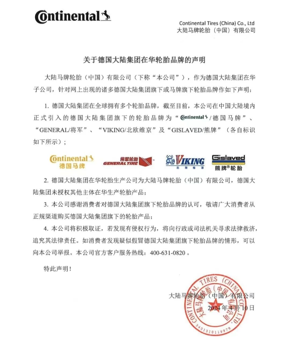 大陸馬牌輪胎中國(guó)公司發(fā)布聲明,保障消費(fèi)者權(quán)益
