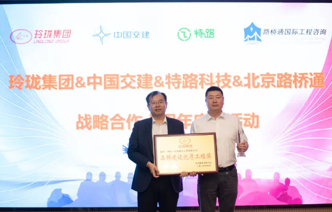 在慶典的高潮部分,玲瓏輪胎副總裁孫松濤代表玲瓏集團(tuán),向中交一公局第五工程有限公司的沈金田副總和北京路橋通國(guó)際工程咨詢有限公司的蘇成林總經(jīng)理頒發(fā)了“品牌建設(shè)優(yōu)質(zhì)工程獎(jiǎng)”榮譽(yù)牌匾,以表彰他們?cè)谥衼嗇喬ピ囼?yàn)場(chǎng)建設(shè)中的杰出貢獻(xiàn)。