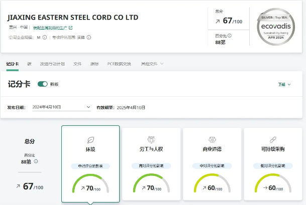 據(jù)悉,EcoVadis認證是一個以企業(yè)社會責任標準ISO26000為基礎(chǔ)的全球供應(yīng)商企業(yè)社會責任認證平臺。嘉興東方鋼簾線有限公司在今年的認證中取得了67分的高分,這充分體現(xiàn)了該公司在可持續(xù)發(fā)展方面的堅定承諾和實踐成果。盡管EcoVadis今年修改了評估規(guī)則,使得獲獎難度增加,但嘉興東方依然脫穎而出,榮獲銀牌獎?wù)?,這無疑是對其長期致力于可持續(xù)發(fā)展的有力認可。