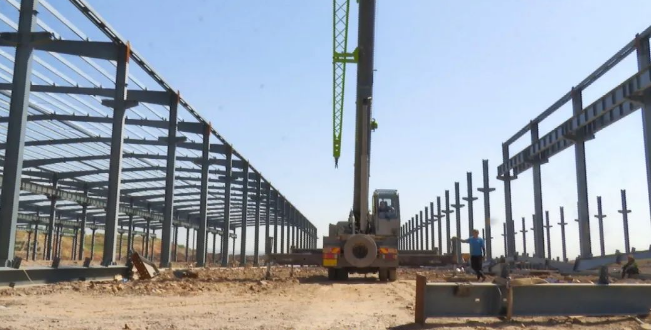 項目的建設進展順利,目前正處于廠房吊裝工程的攻堅階段。施工現(xiàn)場,五個定制型鋼架結構標準化廠房正在有序施工中。其中,前三個廠房的吊裝工程已進入尾聲,鋼柱、鋼梁及不銹鋼頂梁的吊裝工作已基本完成,廠房的雛形已經(jīng)顯現(xiàn)。第四個廠房的鋼柱吊裝也已接近尾聲,而第五個廠房的鋼柱吊裝工作則剛剛啟動。整個吊裝工程預計將在6月底前全面完成。