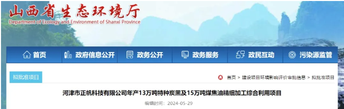 【炭黑產業(yè)網】5月30日消息,山西省生態(tài)環(huán)境廳29日公示,擬批準河津市正帆科技有限公司年產13萬噸特種炭黑及15萬噸煤焦油精細加工綜合利用項目。該項目計劃在山西省運城市河津經濟技術開發(fā)區(qū)建設,總投資額高達98500萬元。