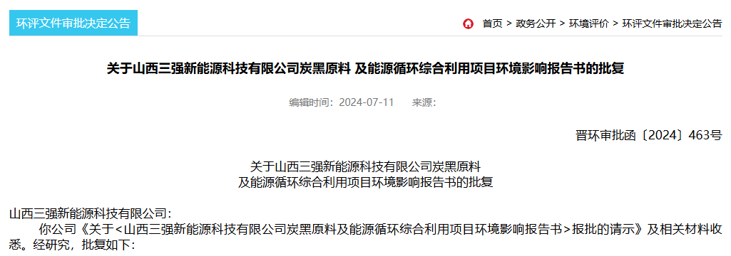 【炭黑產(chǎn)業(yè)網(wǎng)】7月15日消息,山西三強(qiáng)新能源科技有限公司炭黑原料及能源循環(huán)綜合利用項(xiàng)目獲批,文件表示,原則上同意環(huán)境影響報(bào)告書(shū)總體結(jié)論和各項(xiàng)生態(tài)環(huán)境保護(hù)措施。