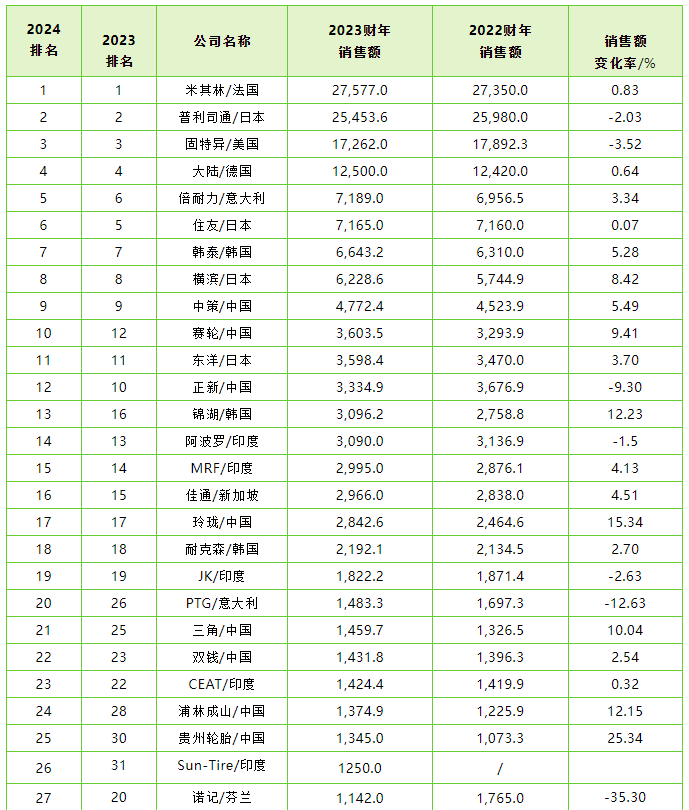8月23日,美國(guó)Tyre Business公布2024年度世界輪胎75強(qiáng)排行榜,依據(jù)各家輪胎公司2023年的輪胎銷(xiāo)售額。