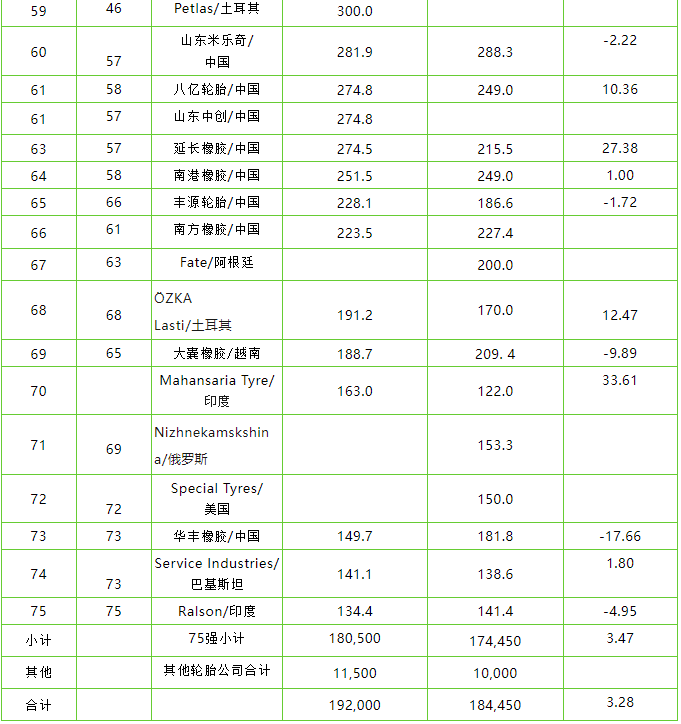 在排名前75位的輪胎制造商中,近一半位于中國(guó),其中17家在今年的榜單上排名有所上升。以下是這些公司的表現(xiàn):