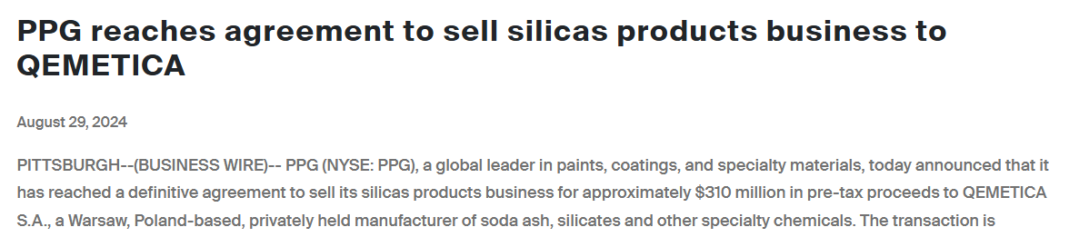 PPG白炭黑業(yè)務要易主,交易預計2024年Q4完成