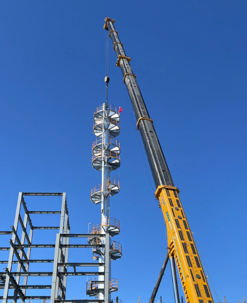 在此次吊裝任務(wù)中,特別值得一提的是,其中一臺(tái)溶劑精制塔(08100-C-2201)高達(dá)42.175米,重達(dá)47.55噸,成為整個(gè)順丁橡膠裝置中體積最大、高度最高的設(shè)備。另外兩臺(tái)塔器,溶劑精制塔(08100-C-1201)和丁二烯精制塔(08100-C-1301),也分別具有相當(dāng)?shù)囊?guī)模和重量。這三臺(tái)塔器的吊裝工作,不僅是順丁橡膠裝置安裝的關(guān)鍵環(huán)節(jié),也是技術(shù)上的巨大挑戰(zhàn)。