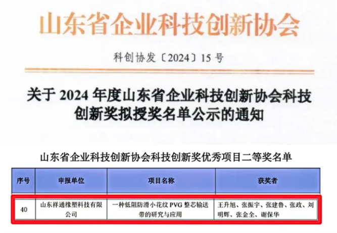 祥通橡塑榮獲山東科技創(chuàng)新獎(jiǎng),輸送帶技術(shù)再獲突破