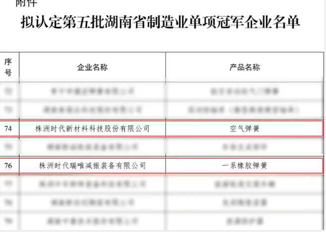 【炭黑產(chǎn)業(yè)網(wǎng)】10月28日消息,湖南省工信廳于近日揭曉了第五批湖南省制造業(yè)單項(xiàng)冠軍企業(yè)的名單,共有180家企業(yè)脫穎而出。其中,時(shí)代新材憑借其卓越的空氣彈簧和一系橡膠彈簧產(chǎn)品成功登榜,榮獲湖南省制造業(yè)單項(xiàng)冠軍企業(yè)的稱號(hào)。
